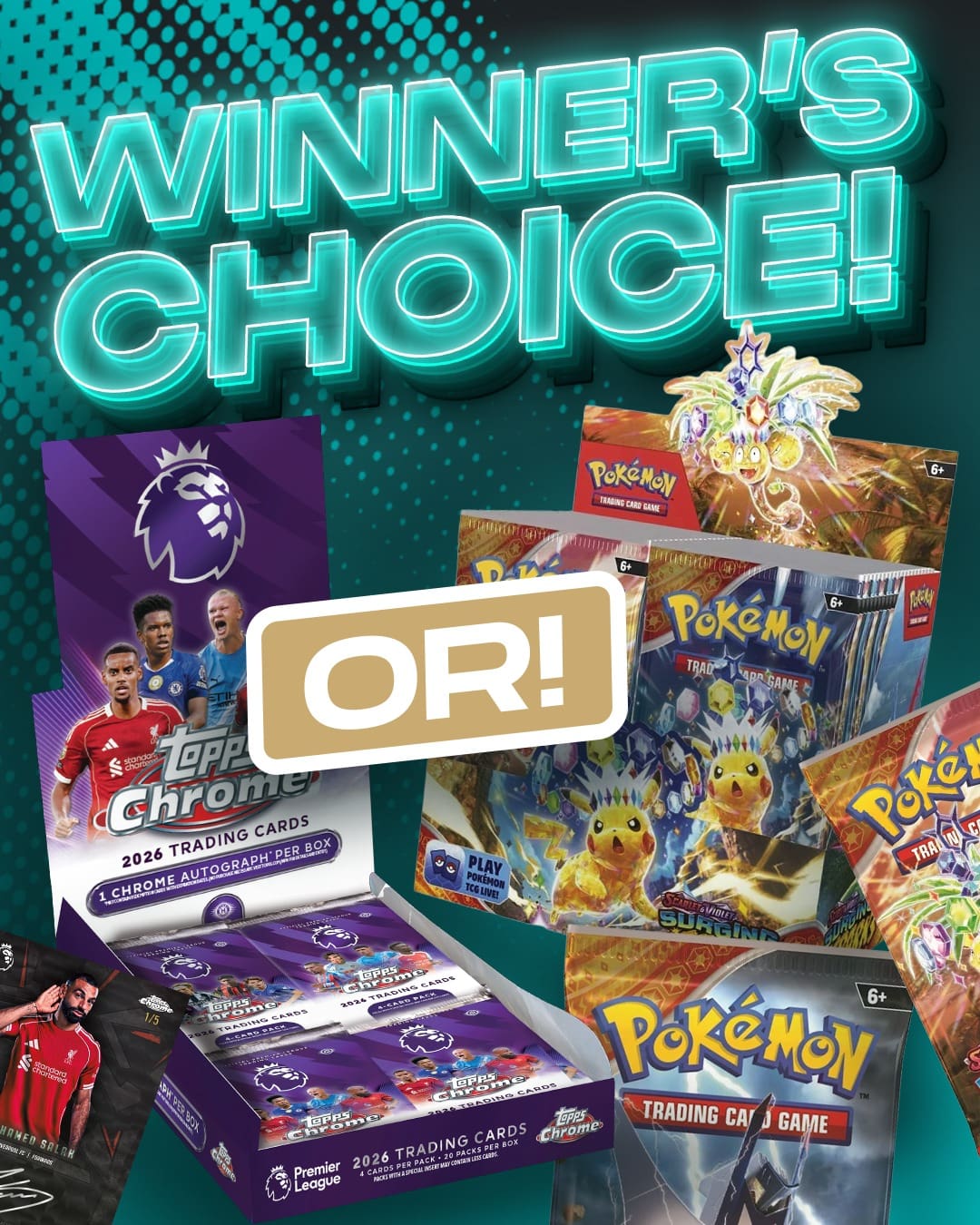 Going slightly different on this comp if you win you’ll get the chance to choose either a box of Topps Chrome Premier League 2026 Hobby Box or a Pokemon surging sparks booster box or a cash alternative £175
